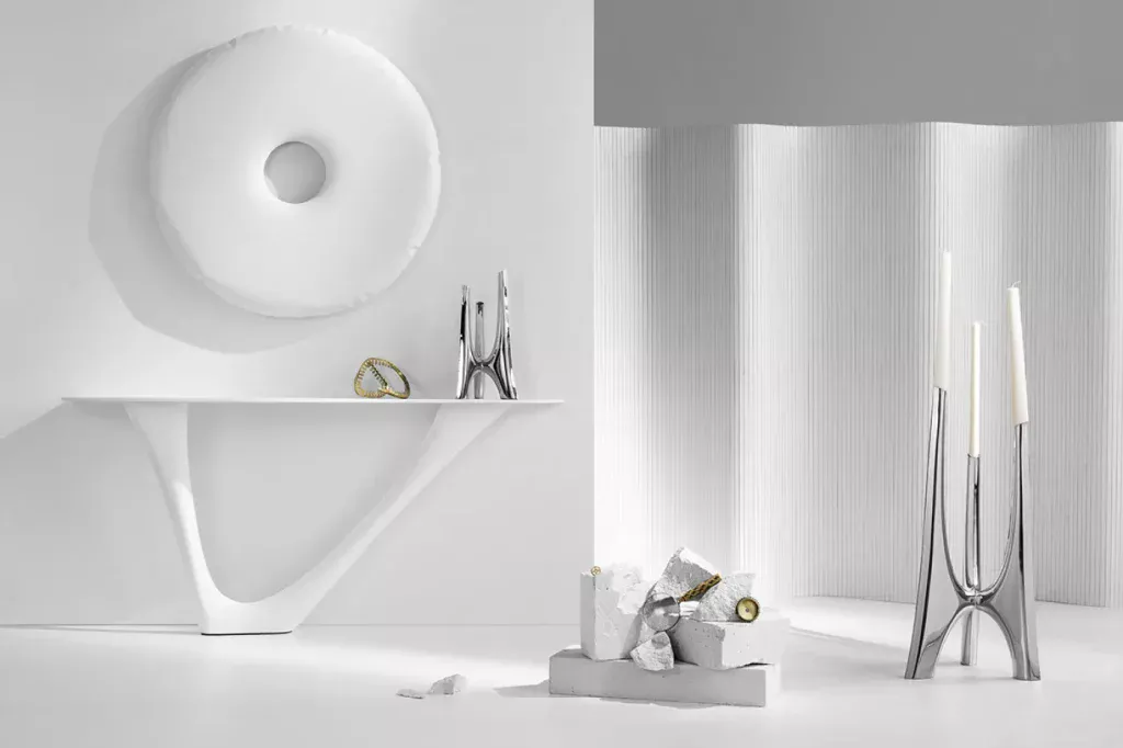 Its bionic legs, shaped in FiDU technology, reminiscent of tree roots, form a vivid base for the console top. With its minimalist design and variety of combinations, the G-CONSOLE equally suits modern and baroque spaces. The size, colour and finish can be chosen according to preference. Note that Zieta’s steel console table is available in two versions: Mono and Duo.